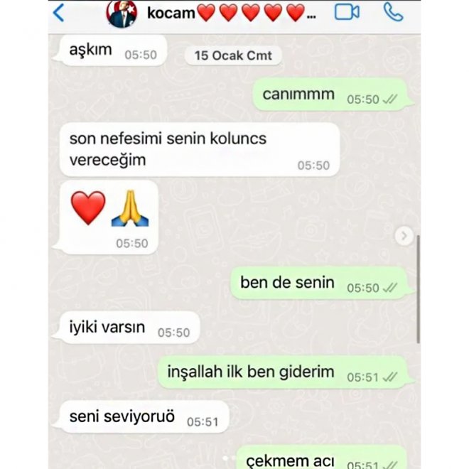 "15.01.22 yazışmamız Dubai'ye yanıma geldiği sabah. Ve bugün canım Şafağımın 40'ı, sabahsız geceler, her günün tekrarı, sadece aynı acıyı yaşayanların anlayacağı 40 gün. Ölmeyecek kadar yaralıyım, Allah'ım kimseye yaşatmasın, eşimi toprağa verdiğim gün nasılsam öyleyim, bakımsız, ne giydiğim nasıl göründüğümün önemi olmadığı sadece eşime dua edeceğim bir gün... Nefesi o kadarmış benim güzel yüzlümün, hiç hak etmediği şekilde kaybettim ve onu çok sevdiğim için biliyorum ki büyük bir sınavdayım, Allah bana kaldıramayacağımdan fazla yük yüklemez diye inanıp yoluma öyle devam ediyorum, oğlumla her zamankinden daha fazla ilgileniyorum, birçok eşini, yakınını kaybedenle görüşüyorum, mesajlaşıyorum, onlarla güçleniyorum, iyileşiyorum, hepsine buradan teşekkür ederim."