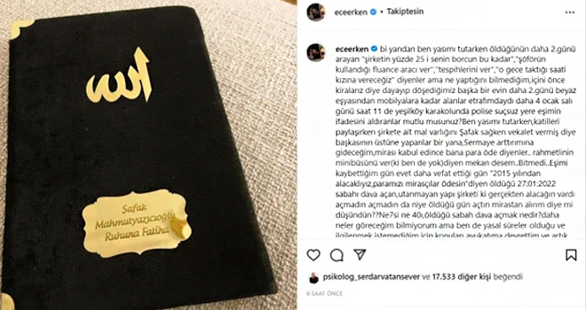 "Bir yandan ben yasımı tutarken öldüğünün daha 2'inci günü arayan, 'Şirketin yüzde 25'i senin, borcun bu kadar', 'Şoförün kullandığı aracı ver', 'Tesbihlerini ver', 'O gece taktığı saati kızına vereceğiz' diyenler ama ne yaptığını bilmediğim, içini önce kiralarız diye dayayıp döşediğimiz bir evin, daha 2'inci günü beyaz eşyasından mobilyalara kadar alanlar etrafımdaydı.