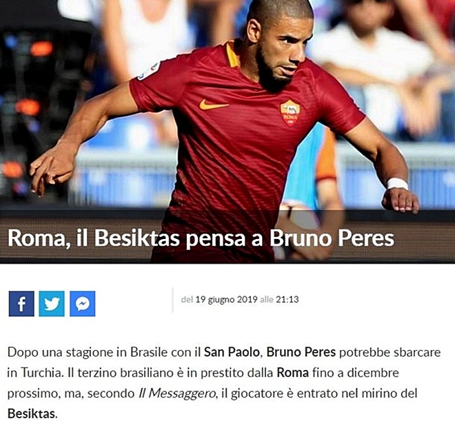 İtalyan basınında Il Messaggero'nun yazdığına göre Beşiktaş, geçmişte de ilgilendiği Bruno Peres için tekrar adım atıyor. Bonservisi Seria A ekiplerinden Roma'da olan oyuncu geçen sezon Sao Paulo'ya kiralanmıştı. Roma ile 2021 yılına kadar sözleşmesi olan ve Aralık ayında Sao Paulo ile kiralık sözleşmesi bitecek olan 29 yaşındaki sağ bekin Brezilya'dan ayrılarak kariyerine Avrupa'da devam etmek istediği öğrenildi.
