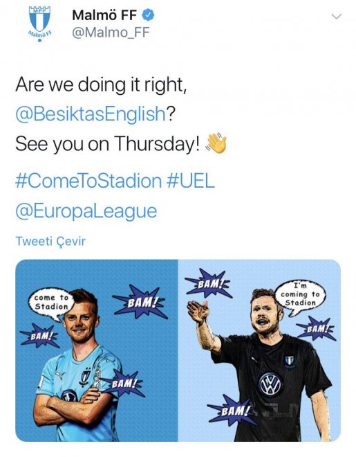 UEFA Avrupa Lig’inde Beşiktaş ile mücadele edecek olan İsveç temsilcisi Malmö, geçen gün sosyal medya hesabında Beşiktaş ile ilgili paylaşımda bulundu. Kara Kartal’ın “Come to Beşiktaş” sloganını kendilerine uygun şekilde değiştiren Malmö, esprili bir paylaşımda bulunarak, şu ifadeleri kullandı: “Doğru mu yapıyoruz? Perşembe görüşürüz!”