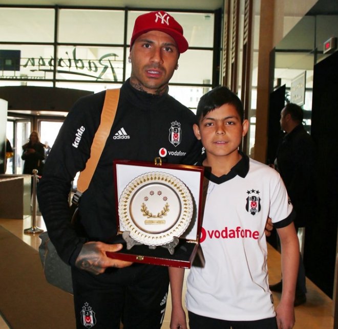 Beşiktaş'ın Portekizli yıldızı Ricardo Quaresma, Kayseri İl Emniyet Müdürlüğü tarafından düzenlenen sosyal sorumluluk projesi kapsamında okula devam edemeyen siyah-beyazlı taraftar Bedirhan Uyumaz ile takımın kamp yaptığı otelde bir araya geldi.
