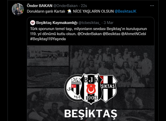 Türkiye'nin en köklü spor kulüplerinden Beşiktaş, 119. kuruluş yılını kutladı. Beşiktaş Kaymakamı Önder Bakan da, Twitter hesabından Beşiktaş JK'nin paylaşımını paylaşarak, 119. yılı kutladı. Kaymakam Bakan, paylaşımında "Dorukların şanlı Kartalı NİCE YAŞLARIN OLSUN @BesiktasJK" ifadelerini kullandı.