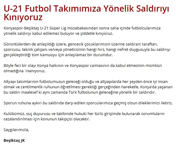 Konyaspor-Beşiktaş U-21 Süper Lig maçından sonra, saha içinde siyah-beyazlı futbolculara yönelik saldırı yaşandı. Yaşanan bu çirkin saldırıyı kınadığını bildiren Beşiktaş JK, resmi web sitesinde saldırıyı kınadıkları hakkında bildiri yayınladı.