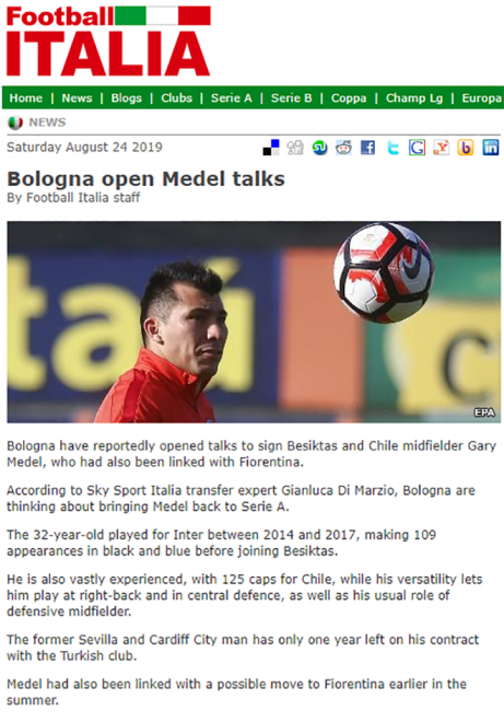 Football Italia'da yer alan habere göre; Bologna, Beşiktaş'ın Şilili futbolcusu Gary Medel ile ilgileniyor. Teknik direktör Sinisa Mihajlovic'in orta sahaya takviye istediği ve Gary Medel transferine sıcak baktığı belirtildi.