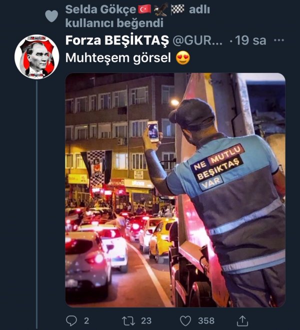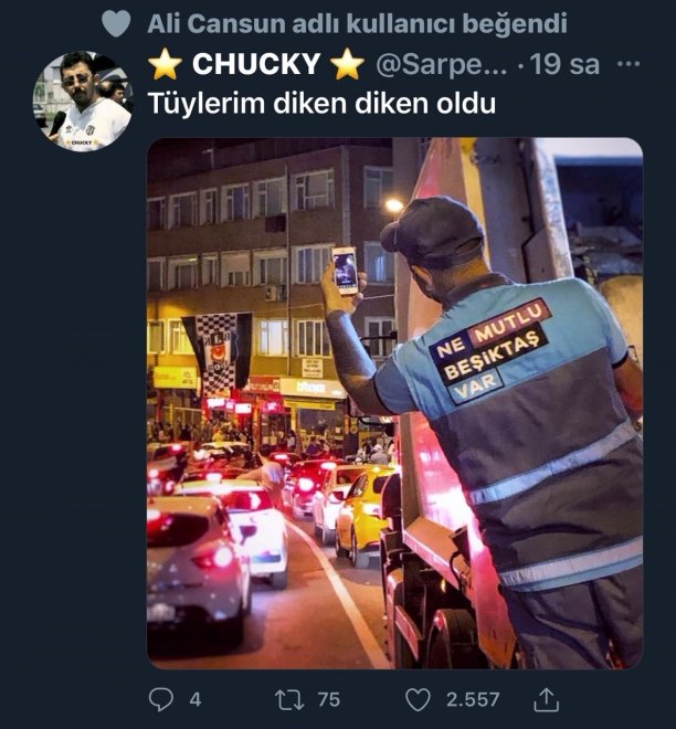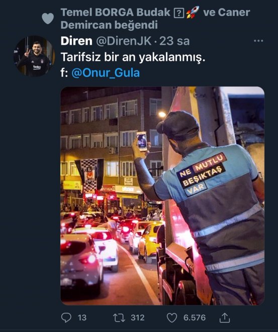 'Abi o gece görevdeydik. Çöpleri topluyorduk. İsmetiye caddesindeydik. Trafik tıkandı kutlamalar başladı. Kornalar çalıyor, Beşiktaş bayrakları sallanıyordu. Çöp aracının arkasındaydım. Telefonumu çıkardım video çekmeye başladım. O arada arkadan bir arkadaş beni çekmiş. Sonra sosyal medyada gördük. Çok kişi konuşmaya başladı. Şaşırdık. Arkadaşlarım eşim dostum akrabalar arıyor'