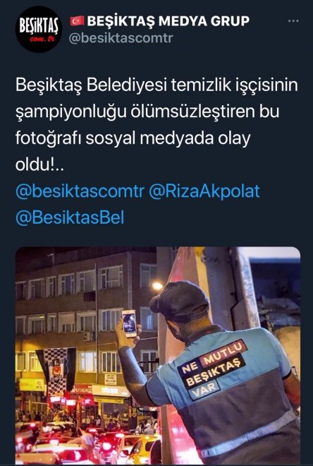 'Grurluyuz diye twit atarak, emekçilere gösterdiği hassasiyete bir kez daha dikkat çeken Beşiktaş Belediye Başkanı Rıza Akpolat'ın bu kardeşimizle bir fotoğraf verip, Şampiyon Beşiktaş ve Beşiktaş taraftarlığı ile Beşiktaş Belediyesinin tanıtımına katkıda bulunduğu için teşekkür edeceğine ve emekçilerin mutluluğunu paylaşacağına kesin gözle bakılıyor.