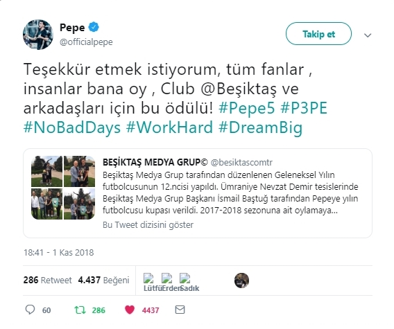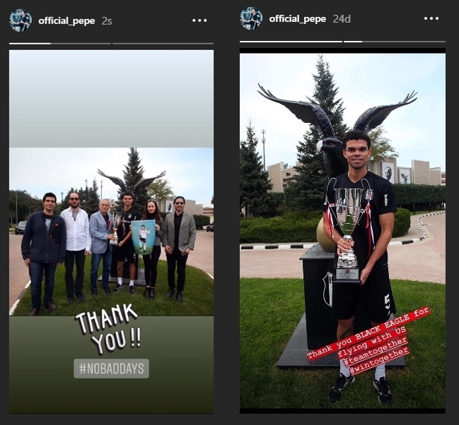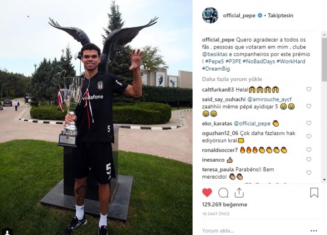 Ödülden dolayı duyduğu sevinci sosyal medya hesaplarında paylaşarak teşekkür eden Pepe’nin paylaşımları kısa sürede rekor kırdı. Twitter hesabından yaptığı paylaşımına kısa zamanda 4 bin 400’den fazla beğeni gelirken, instagram hesabından yaptığı paylaşımına ise, 129 binden fazla beğeni geldi. Instagram’da hikayesinde de ödülünün sevincini paylaşan Pepe, resmin üzerine “Thank You! #NOBADDAYS” yazdı.