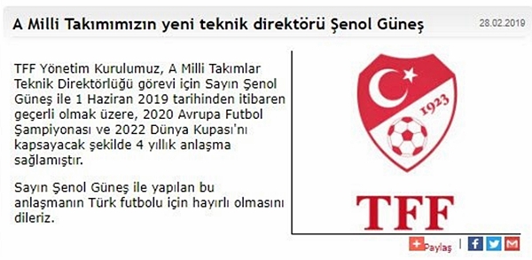 Türkiye Futbol Federasyonu'ndan Şenol Güneş hakkında açıklama geldi. TFF'den yapılan resmi açıklamaya göre, A Milli Futbol Takımı Teknik Direktörlüğü için Beşiktaş'ın çalıştırıcısı Şenol Güneş ile anlaşıldığı bildirildi. Duyuruda, TFF Yönetim Kurulu'nun A Milli Takımlar Teknik Direktörlüğü görevi için Şenol Güneş ile 1 Haziran 2019 tarihinden itibaren, 2020 Avrupa Futbol Şampiyonası ve 2022 Dünya Kupası'nı kapsayacak 4 yıllık anlaşma sağlandığı ifade edildi.