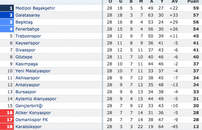 Son yılların en çekişmeli bir sezonu olan Süper Lig 28. hafta oynanan maçlar sonunda Medipol Başakşehir'in puanı 59, ikinci Galatasaray'ın 57, üçüncü durumda bulunan Beşiktaş'ın puanı 56 olurken, Fenerbahçe 54 puanla dördüncü sırada yer aldı.