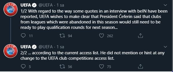 Medyadan edinilen bilgilere göre; UEFA, resmi Twitter hesabından Başkan Aleksander Ceferin'in açıklamalarıyla ilgili bir düzeltme metni yayınladı. Ceferin, verdiği röportajda "Ulusal liglerde sezonu bitirmeyen takımlar Avrupa kupalarında ön eleme oynayacaklar. Bunu göz önüne almaları gerekiyor." ifadelerini kullanmıştı. Sezonun erken tescil edildiği Hollanda, Fransa ve Belçika gibi liglerin Şampiyonlar Ligi için kafaları karıştıran bu açıklamaya UEFA'dan düzeltme geldi. UEFA'nın sosyal medyadan yaptığı duyuruda, Ceferin'in Avrupa kupalarına katılım şartlarında bir değişim olacağını belirtmediği ifade edildi.