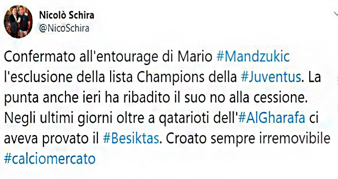 La Gazzetta dello Sport muhabiri Nicolo Schira'nın duyurduğu habere göre; siyah beyazlılar Juventus'tan Mario Mandzukic'i transfer etmek istedi. Ancak Juventus, Hırvat golcüsünü bırakmak istemedi.