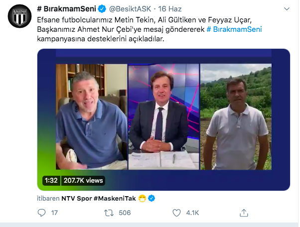 Fenerbahçe’nin efsane futbolcularından Rıdvan Dilmen de Beşiktaş kampanyasına destek veren isimlerden oldu. Aynı dönemde futbol oynadığı Beşiktaşlı Metin Tekin, Ali Gültiken ve Feyyaz Uçar’ın “Bırakmam Beşiktaşım Seni” dediği videoyu yayınlayan Rıdvan, futbolseverleri kampanyaya destek vermeye çağırdı.