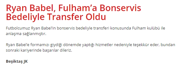 Siyah beyazlı ekipte Ryan Babel sorunu devam ediyor. Beşiktaş yönetimin yeni sözleşme için yıllık 2.2 milyon Euro önerdiği Hollandalı yıldız 3 milyon Euro’da diretiyor. Taraftarla sosyal medyada yaşadığı polemik ve bir türlü iyileşmeyen sakatlığı ile gündemde olan Ryan Babel'in yeni sözleşme görüşmelerinde de sorun yarattığı ortaya çıktı.
