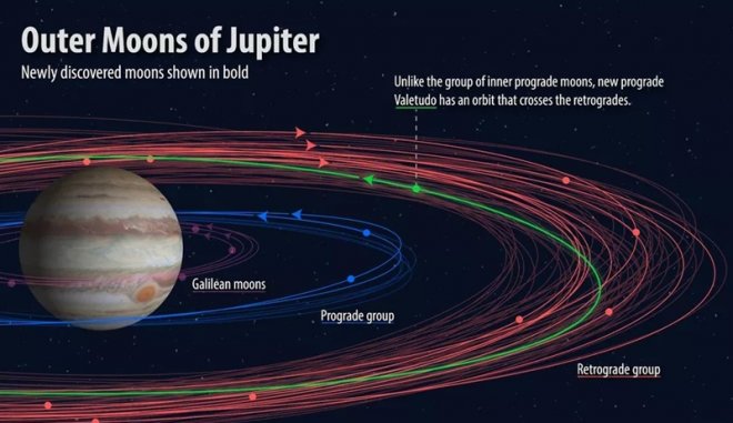 Bu uydulardan 9 tane ters yönde dönen ve aynı uzak bölgede astronomların Valetudo adını verdikleri tuhaf bir ay var. Jüpiter’in dönüşü ile hareket eden bu ay, aynı alandaki diğer uydularla ters yönde ilerliyor. Konu hakkında konuşan astronomlar, bu durumun çok istikrarsız olduğunu ve çarpışmaların meydana gelebileceğini söylediler. Ancak Valetudo, Jüpiter’in ters yönde hareket eden tek ayı değil. Carpo isimli başka bir ay da bir çok ayın ters yönünde hareket ederek Jüpiter’den uzaklaşıyor. Bilim adamları Valetudo hakkında, sadece 1 kilometre uzaklıkta olduğunu ve muhtemelen zaman içinde toz haline gelmiş büyük bir ayın son kalıntıları olduğunu ileri sürüyor.