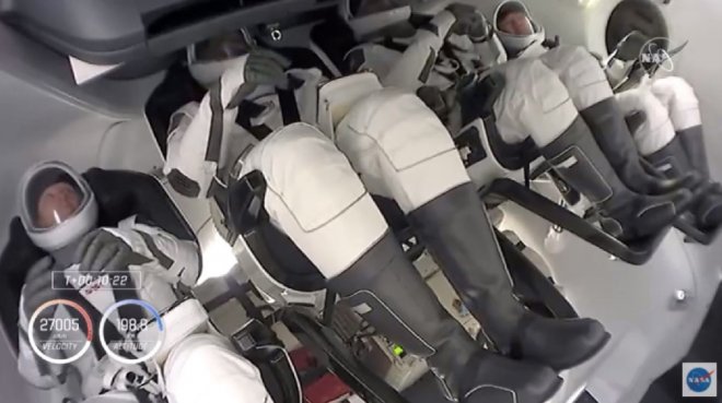 Öte yandan NASA ve SpaceX uzay yolculuğunu kabin içindeki kameradan canlı olarak paylaştı. Görüntülerde astronotların bileğindeki yansıtıcı bileklik ise kafaları karıştırdı. Birçok sosyal medya kullanıcısı parlak nesnenin kumanda olduğunu söyledi. Fakat gerçekte bu parçanın bir ayna olduğu ve bu sayede astronotların kostümlerinin üzerinde yazan yönlendirme ve uyarıları okuyabildiği ortaya çıktı.