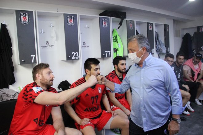 Siyah-beyazlıların Göztepe’yi 37-27 mağlup ederek Hentbol Türkiye Kupası’nda finale yükseldiği maçı tribünden takip eden Çebi, müsabakanın ardından teknik ekip ile sporcuları kutladı.