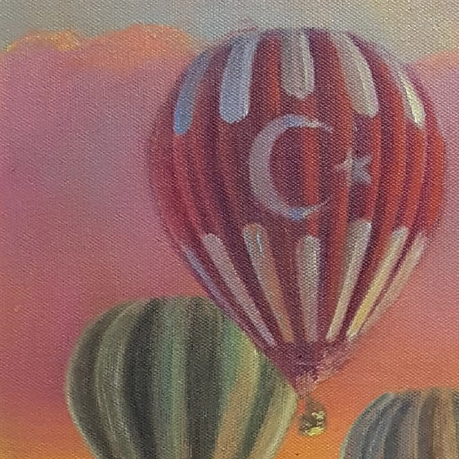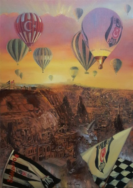 Geçtiğimiz günlerde Göreme'yi tablo dokümanları toplamak için ziyaret ettim.Hava şartları nedeniyle birkaç gün uçuşlar iptal olsa da balonların göğe yükseldiği muhteşem anları objektifimden yakaladım. İstanbul'a döner dönmez tablo üzerinde çalışmaya başladım. Bu çalışmamda Beşiktaş sevgisinin sadece semt ve İstanbul sınırlarından ibaret olmadığını, Türkiye'nin her yerinde denizde, karada ve hatta gökte bile siyah-beyaz tutkusunun her daim var olduğunu vurgulamaya çalıştım."