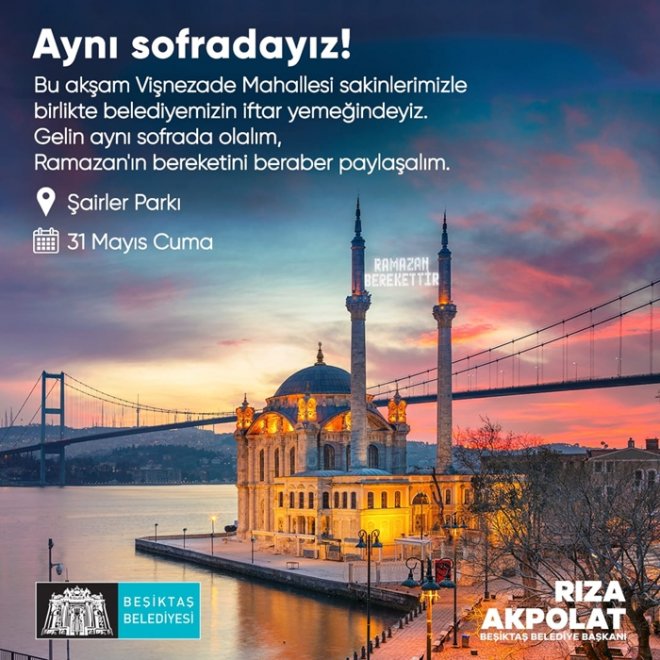 Beşiktaş Belediyesi, Ramazan ayı boyunca Beşiktaş’ın farklı mahallelerinde iftar sofraları kurdu ve vatandaşları bir araya getirdi. Binlerce vatandaşı bir araya getiren Ramazan ayı buluşmaları bayram tatili öncesi 31 Mayıs akşamı mübarek Kadir Gecesi’nde Şairler Park’ında iftar programı ile son bulacak.