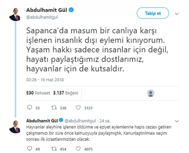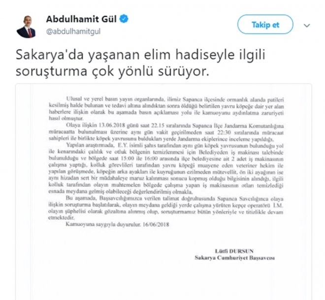 Adalet Bakanı Abdülhamit Gül, Twitter hesabından yaptığı açıklamalarda yavru köpek ile ilgili olay hakkında şu ifadelere yer verdi: