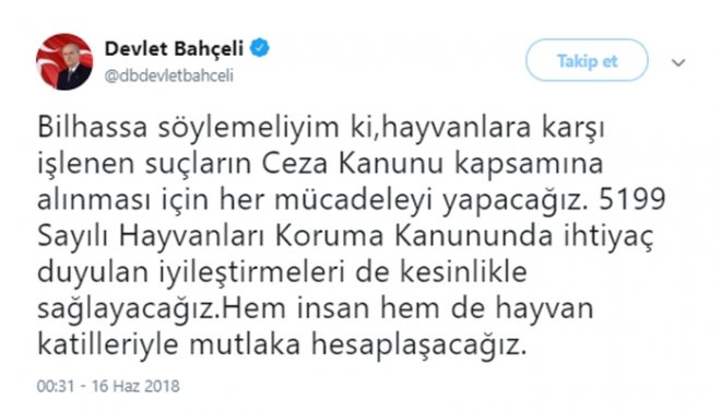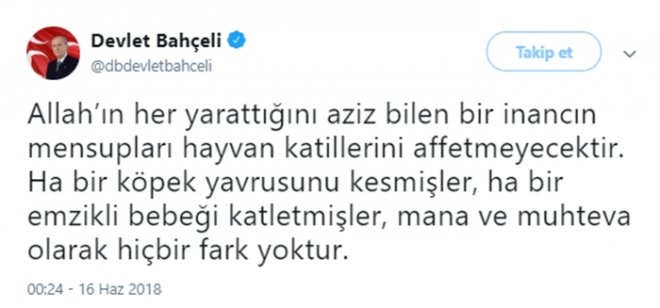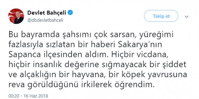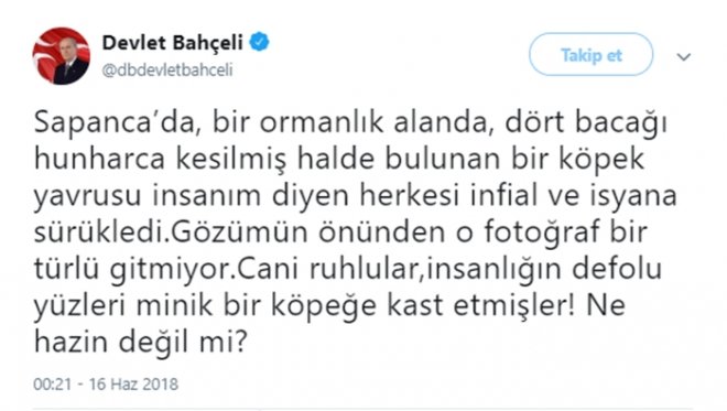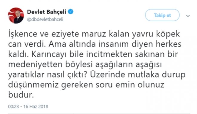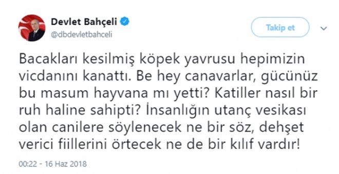 MHP Lideri Devlet Bahçeli bacakları kesilerek hayatını kaybeden yavru köpek hakkında Twitter'da tepkisini ortaya koydu:
