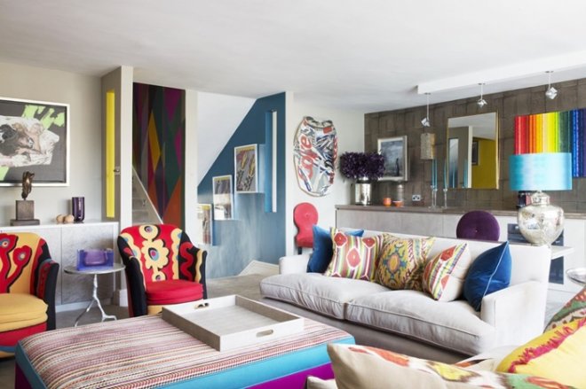 Bu kadar çeşitli ve renkli bir tarzda doğru ışık tercihi sayesinde göz yormadan, köşelerde bulunun lambalardan yayılan hafif loş ışık ile tüm eşyaların arasında uyum sağlamak, bu dekorasyonun en önemli inceliği.