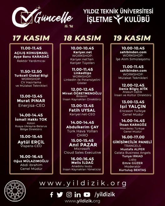 'Yıldız İşletme Kulübü olarak 17-18-19 Kasım tarihlerinde düzenleyeceğimiz CV’ni Güncelle etkinliğimizi yapıyoruz. CV’ni Güncelle, üst düzey yöneticilerin katılımlarıyla markalaşmadan pazarlamaya, liderlikten CV hazırlamaya kadar iş dünyasının önemli konu başlıklarının konuşulduğu bu yıl pandemi sebebiyle yildizik.org sitemizde online olarak gerçekleşecek kariyer etkinliğimizdir'