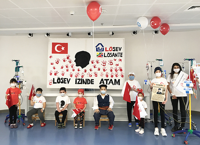 LÖSEV Lösemili Çocuklar Sağlık ve Eğitim Vakfı’na kayıtlı olup ücretsiz tedavi hizmeti için LÖSANTE Çocuk ve Yetişkin Hastanesi’nde yatan lösemili ve kanserli çocuklar Türkiye Cumhuriyeti’nin kuruluşunun 97 yıldönümünü coşkuyla kutladı. Mücadeleci minikler gözlerini 29 Ekim sabahına açtıklarında katlarının tavanlarının bayrama özel kırmızı beyaz balonlar ile kaplandığını gördü. Balonların uçlarından kendilerinin yaptığı ay-yıldız motiflerinin sallandığını fark eden LÖSEV’li çocuklar 29 Ekim’e özel menü ile kahvaltılarını yaptı. Kahvaltıdan sonra onları asıl şaşırtan ise içlerinden bir arkadaşlarının postacı kostümüyle koridorda koşuşarak “yazıyor, yazıyor meclisin kuruluşu yazıyor…” diye bağırması oldu. Tüm odalardaki çocuklar merakla kapılarına koşup arkadaşlarının kendilerine doktorlara ve hemşirelere Cumhuriyet Gazetesi 29 Ekim 1936 nüshasını dağıttığını gördü. Cumhuriyet’in ilanının duyurulduğu bu gazeteyi heyecan ve dikkatle inceleyen çocuklardan bir grup daha sonra sırayla “Cumhuriyet hürriyettir”, “Cumhuriyet eşitliktir”, “Cumhuriyet özgürce yaşamaktır” dedikten sonra hep bir ağızdan “Yaşasın Cumhuriyet” diye haykırdı. Daha sonra hep birlikte saygı duruşu, İstiklal Marşı, İzmir Marşı okuyan LÖSEV’li minikler son olarak “Bir inanç bin bir emek ile yürürüz durmadan geleceğe, sevgidir tek hedefimiz çünkü biz LÖSEV’liyiz” sözlerini barındıran LÖSEV Marşı’nı okudu.
