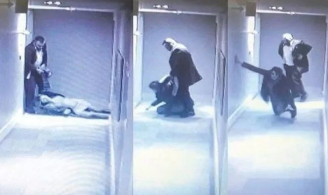 Görüntülerde çiftin tartıştığı, Özgür A.'nın eşini yerde sürüklediği ardından da genç kadının eşinden kurtularak kaçtığı kayıtlara geçiyor.