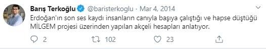 Barış Terkoğlu, 4 Mart 2014 tarihinde Twitter'daki şahsi hesabından, "Erdoğan'ın son ses kaydı insanların canıyla başıya çalıştığı ve hapse düştüğü MİLGEM projesi üzerinden yapılan akçeli hesapları anlatıyor" ifadelerini kullandı ve FETÖ'nün yasa dışı ses kayıtları üzerinden algı operasyonu gerçekleştirdi.