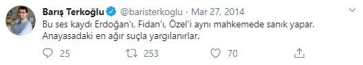 Barış Terkoğlu, 27 Mart 2014 tarihinde Twitter'daki şahsi hesabından FETÖ'nün yasa dışı ses kayıtları üzerinden dönemin Başbakanı Recep Tayyip Erdoğan, MİT Müstaşerı Hakan Fidan ve dönemin Genelkurmay Başkanı Necdet Özel'i hedef aldı ve "Bu ses kaydı Erdoğan'ı, Fidan'ı, Özel'i aynı mahkemede sanık yapar. Anayasadaki en ağır suçla yargılanırlar" iddiasında bulundu.