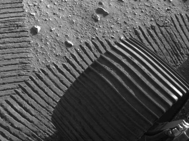Gezginin altı alüminyum tekerleği, 13 fit düz gittikten sonra 8 fit geri döndükten sonra, yerleşik kameralarından birinin yakaladığı gibi, Mars toprakları üzerinde iz bıraktı.