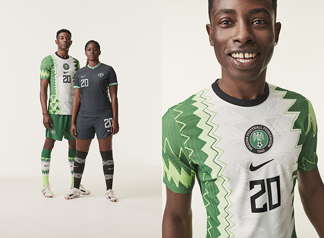 2018’de Naija, Nike’nin federasyon forması tasarımlarına yaklaşımında yeni bir standart belirleyen koleksiyonuyla büyük bir değişim başlattı. Nijerya, 2020’de agbada kaftanının geleneksel estetiğini modern futbol tasarımıyla birleştiren bir iç saha forması ile kaldığı yerden devam ediyor. Deseni elle çizilen forma, soyluluğa ve aileye yaptığı vurguyla Nijerya’nın mirasını güçlü bir şekilde yansıtıyor. Nijerya arması altında Nike amblemi olacak şekilde göğüs bölgesine yerleştirildi. Kartal tüyü teması, oyuncu isimleri ve numaralarında da yer alıyor. “Naija” formanın boynunun içinde ve çorapların arkasında yeni bir yazı tipinde görünüyor.