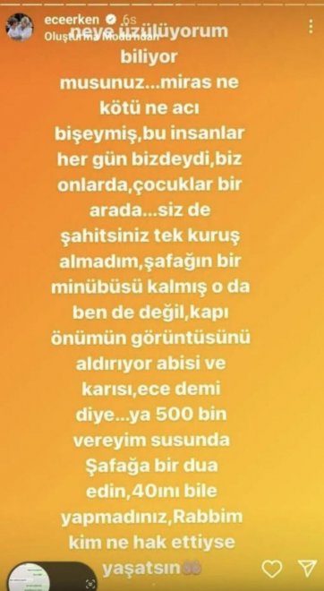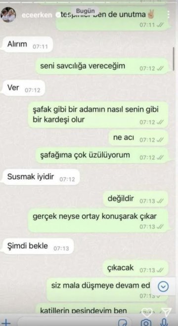 "Siz de şahitsiniz tek kuruş almadım! Şafak’ın bir minibüsü kalmış o da bende değil. Kapı önümün görüntüsünü aldırıyor abisi ve karısı Ece’de mi diye!" "Ya 500 bin vereyim de susun da Şafak’a bir dua edin! 40’ını bile yapmadınız Rabbim kim ne hak ettiyse yaşatsın."