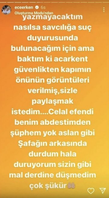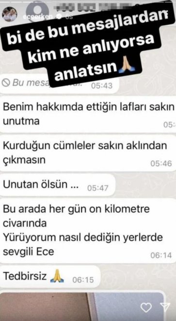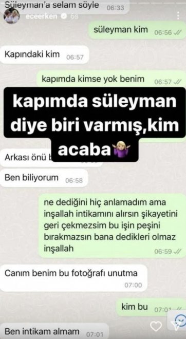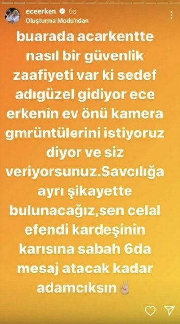 Erken, mesajlarla birlikte şu ifadeleri kullandı:"Sabaha kadar bana tehdit mesajı atan Celal’cik! Sedef’i Acarkent’in güvenliğine göndermişsin. Evimin önünün kamera görüntülerini almışsın."