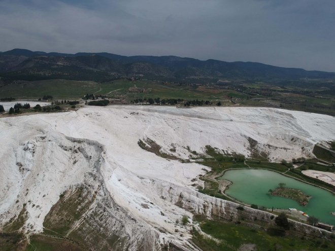 Eşsiz güzelliğiyle görenleri kendine hayran bırakan Pamukkale'nin bu hali, drone ile havadan görüntülendi.