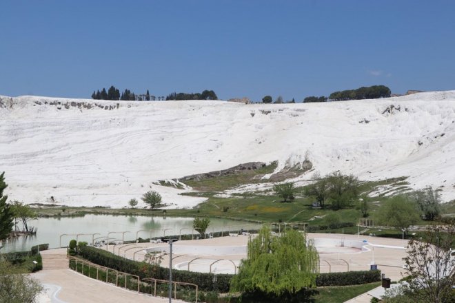 UNESCO Dünya Kültür Mirası Listesi'nde yer alan ve 19 Mart'tan bu yana corona virüs tedbirleri kapsamında ziyaretçi alınmayan Pamukkale, uzun süredir kapalı kalması nedeniyle bembeyaz olan görüntüsüyle dikkat çekiyor. NTV'den edinilen bilgilere göre; Türkiye'nin en önemli turizm alanlarından Pamukkale'de coronavirüs salgını nedeniyle sessizlik hakim oldu.