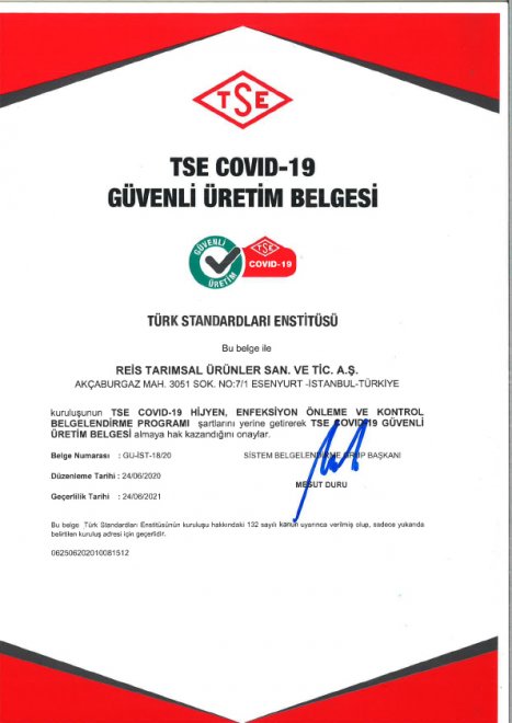 Covid-19 kapsamında gerçekleştirdiği üst düzey hijyen tedbirleri, bilgilendirici kitapçıkları, personel eğitimleri, üretim, yemekhane, dinlenme alanları, lojistik ve personel servislerindeki uygulamaları ve tüm paydaşların sağlığını gözeten çalışmaları ile T.C. Sanayi ve Teknoloji Bakanlığı’nın önderliği ile TSE tarafından yayınlanan "Covid-19 Hijyen, Enfeksiyon Önleme ve Kontrol Kılavuzu’nda belirlenen tüm kriterlere uygunluğu denetlenerek COVID-19 Güvenli Üretimi Belgesi’ni alan firmalar arasında yer aldıklarını ifade eden Reis Gıda Yönetim Kurulu Üyesi Işılay Reis Yorgun, topluma karşı yükümlülerin yerine getirilmesi konusunda COVID-19 Güvenli Üretim Belgesi’nin önemli bir yere sahip olduğuna dikkat çekti.